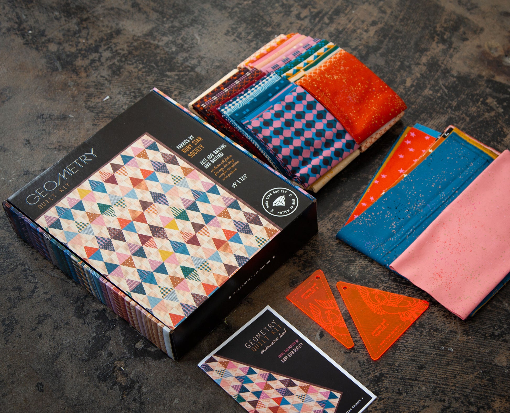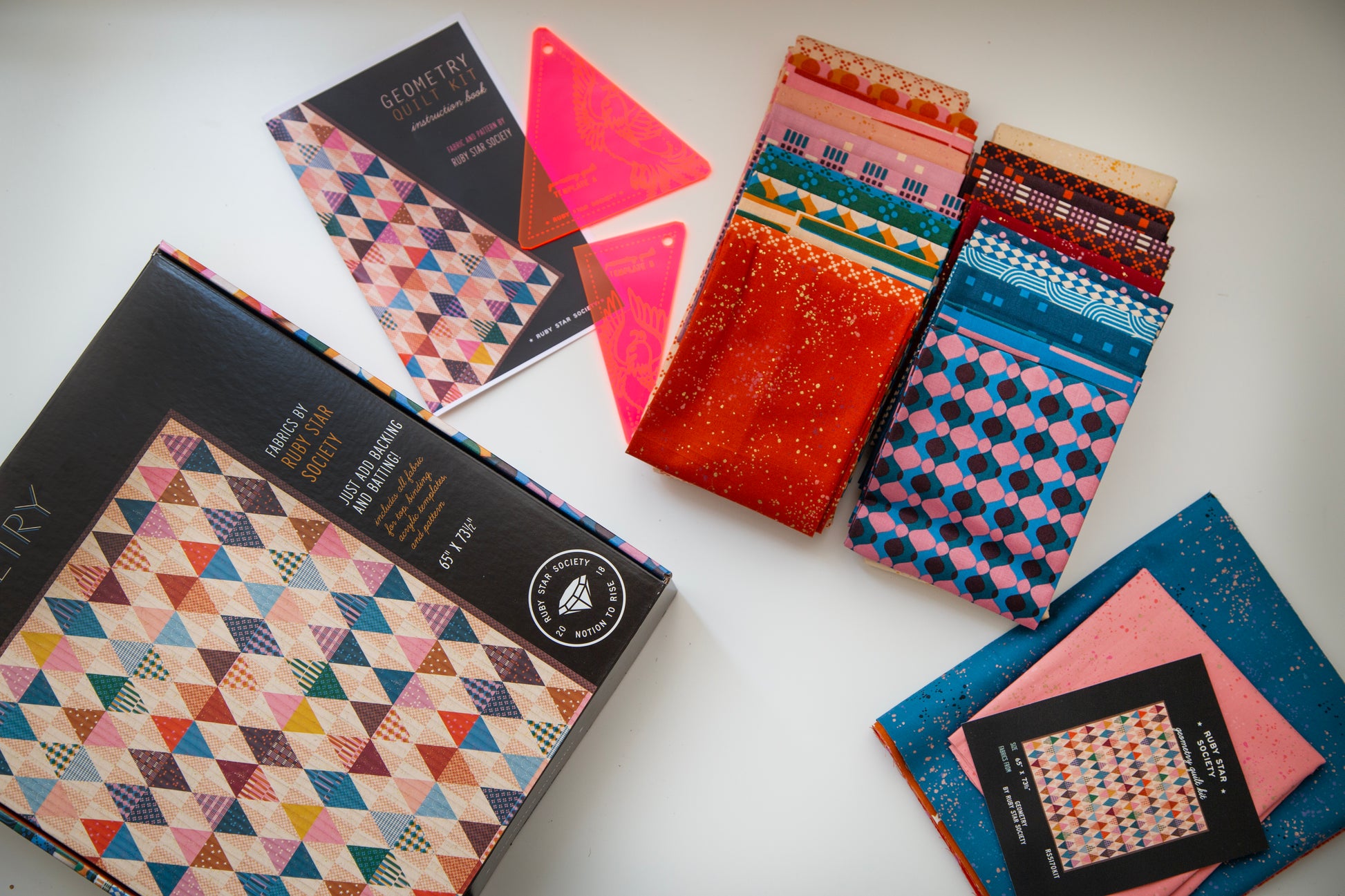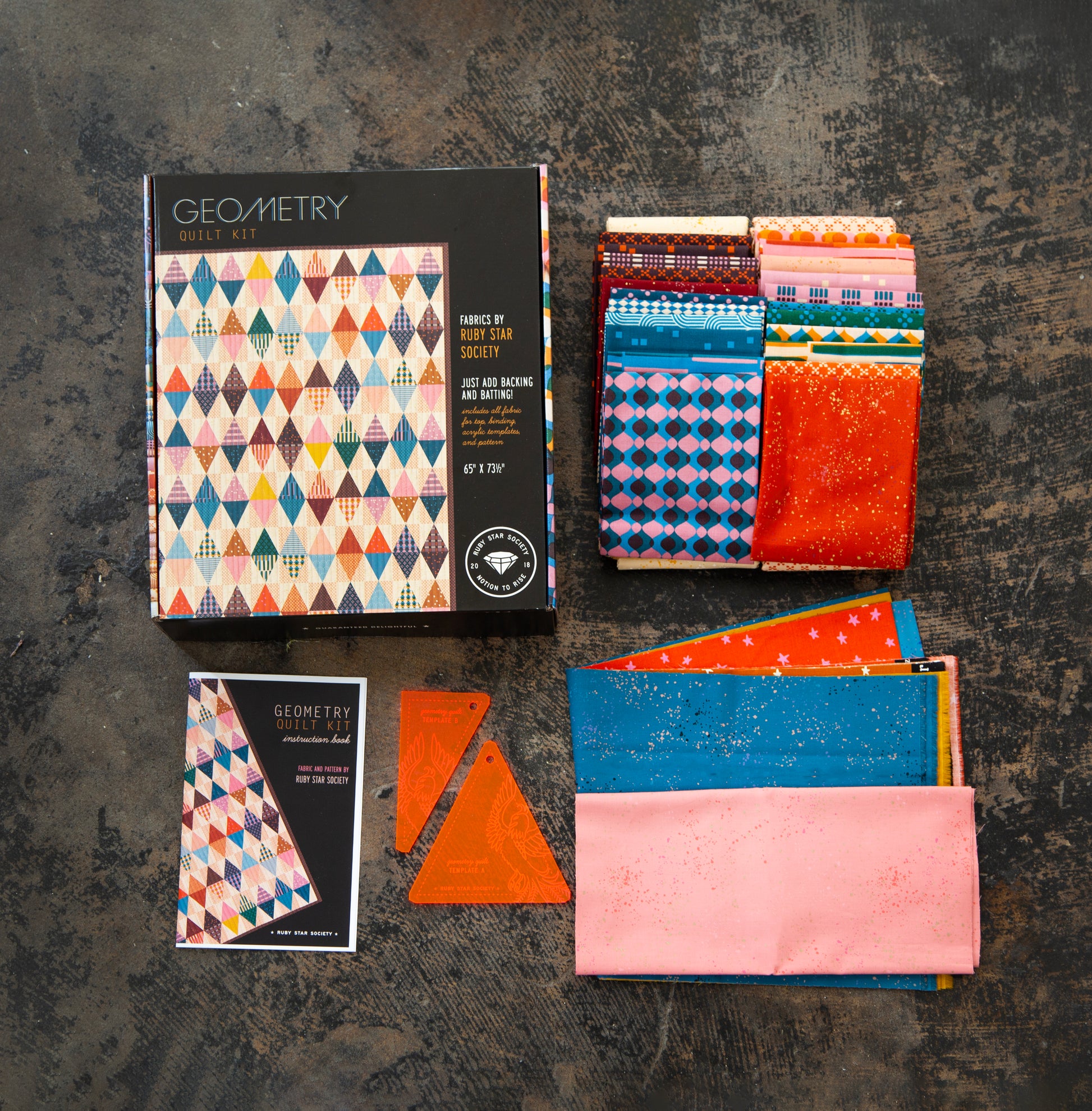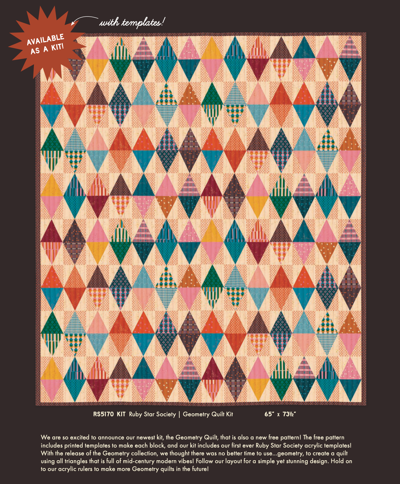 "We are so excited to announce our newest kit, the Geometry Quilt, that is also a new free pattern! The free pattern includes printed templates to make each block, and our kit includes our first ever Ruby Star Society acrylic templates!