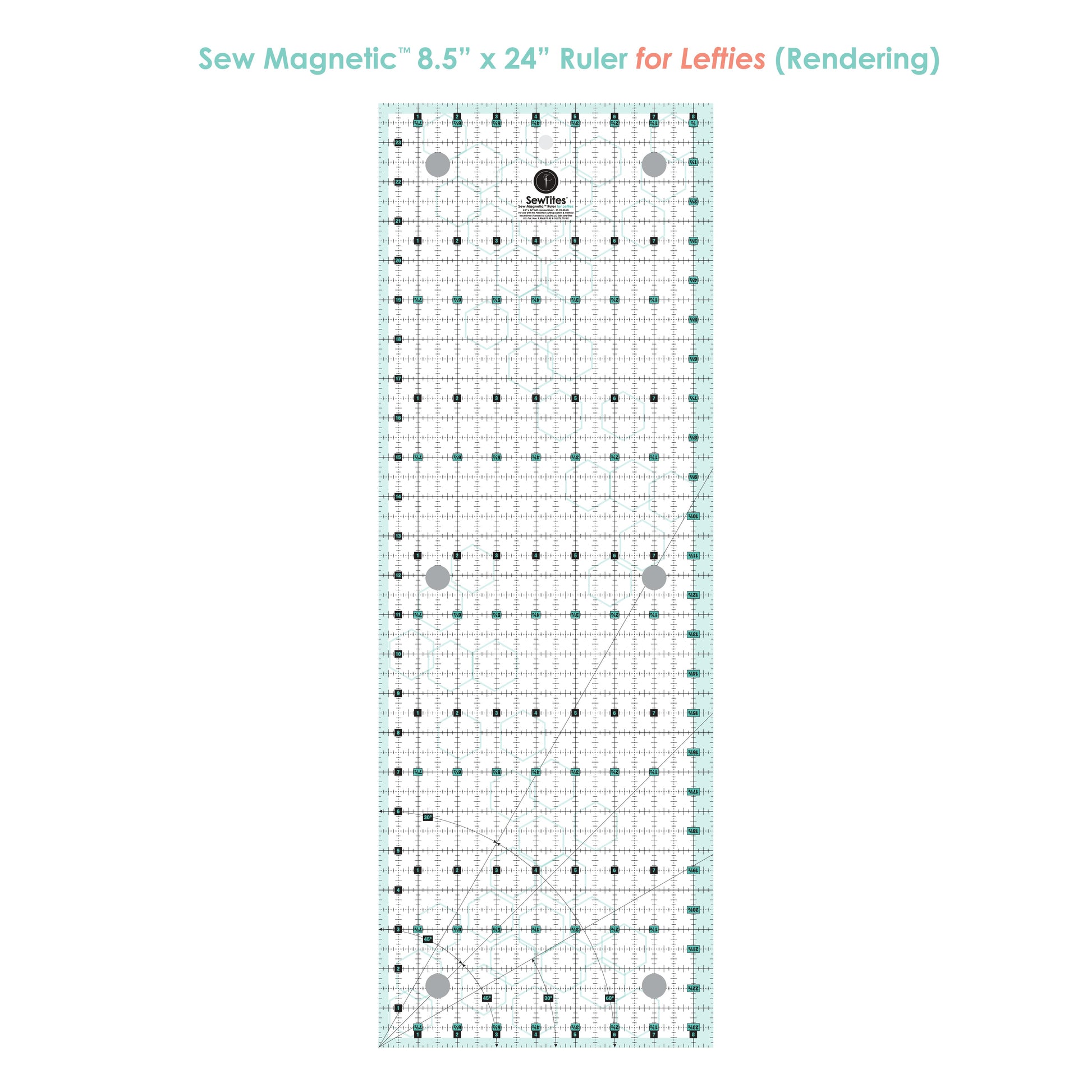 This Sew Magnetic ruler is a 8.5" x 24" acrylic ruler with turquoise and black imprint – the 1/2" numbers are in turquoise boxes, and the 1" numbers are in black boxes.
